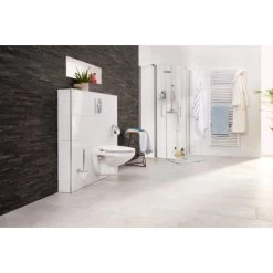 Das Bad-Set 3 in 1 gehört zu der Serie Essentials. Das Set besteht aus einem Badetuchhalter mit einer Länge von 60 cm, einem Bademantelhaken und einem WC-Papierhalter mit Deckel. Alle Artikel sind aus Metall und haben eine GROHE StarLight Chromoberfläche. Zudem haben alle Artikel eine verdeckte Befestigung.