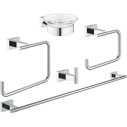 Das Grohe Essentials Cube Accessoires-Set bietet eine komplette Lösung für Badezimmer-Accessoires. Verleihen Sie Ihrem Badezimmer mit sorgfältig ausgewählten Accessoires eine klare, kubistische Note. Das 5-in-1-Accessoires-Set enthält die essentiellen Elemente für ein elegantes, komfortables Konzept. Es besteht aus einem Handtuchring, einem 600 mm Handtuchhalter, einem Bademantelhaken, einem WC-Papierhalter und einem Halter mit Seifenschale.