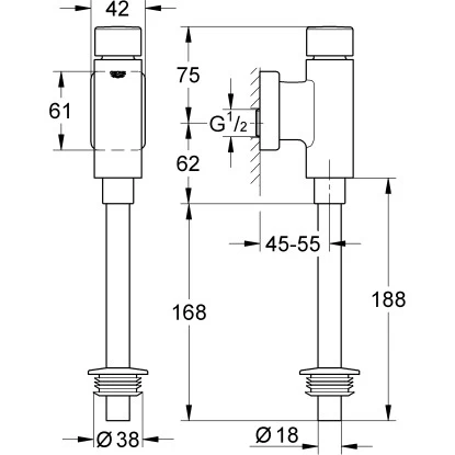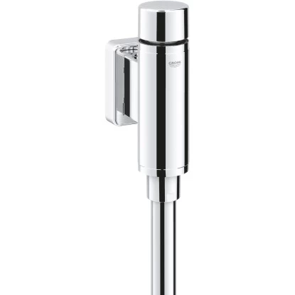 Der Grohe Druckspüler für Urinal Rondo mit vandalensicherem Metall-Betätigungsknopf für das Urinal verfügt über eine integrierte Vorabsperrung und entspricht der Größe DN 15. Dieser verfügt über eine vandalensicheren Metall-Betätigungsknopf eine Betätigungskappe und einen Abgangsstutzen. Das Spülrohr ist 20 cm groß und die Innenverbindung besteht aus einer Rosette. Der Fließdruck sollte mindestens 0,5 bar betragen und der Betriebsdruck maximal 5 bar.
