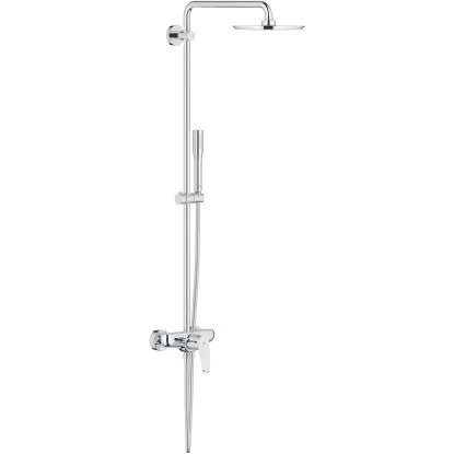 Das Grohe Duschsystem Euphoria Eurodisc Cosmopolitan System 210 besteht aus einem horizontal schwenkbaren 45 cm Duscharm, einer Aufputz-Einhand-Brausebatterie mit Umstellung, die den Wechsel zwischen der Rainshower Cosmopolitan 210 Metall-Kopfbrause (28 368) und der Handbrause Euphoria Cosmopolitan Stick (27 400) ermöglicht, und einem 175 cm Silverflex Brauseschlauch (28 388). Die Kopfbrause ist mit einem Kugelgelenk ausgestattet und besitzt einen Drehwinkel von ± 15°. Die Handbrause ist mittels Gleitelement in der Höhe verstellbar und hat die Strahlart Rain, die einem Sommerregen gleicht.