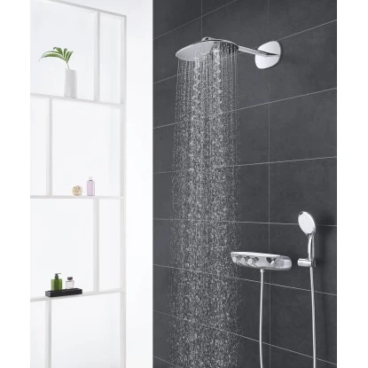 Das Grohe Duschsystem Rainshower SmartControl wertet Ihre Dusche elegant auf. Die hochwertige Grohe StarLight Oberfläche in Chrom überzeugt mit einer sanften Linienführung und passt sich harmonisch nahezu jedem Badezimmer an. Die StarLight Oberfläche sieht nicht nur besonders gut aus, sondern ist auch sehr resistent gegenüber Kratzern und von daher sehr pflegeleicht. Wischen Sie die Oberfläche einfach mit einem Tuch ab und schon erstrahlt das Chrom wieder in gewohntem Glanz.