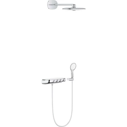 Dank Grohe SafeStop Plus beinhaltet die Brausebatterie eine integrierte Sicherheitssperre bei 38° C. So wird verhindert, dass sich das Wasser zu stark erhitzt, falls Sie mal ausversehen gegen das Thermostat kommen. Der Temperaturenanschlag kann optional auf 43° C erweitert werden. Das Grohe TurboStat verhindert, dass Temperaturschwankungen auftreten. Durch die Grohe CoolTouch Technologie wird verhindert, dass sich die EasyReach Ablageflächen erhitzen. Das Thermostat ermöglicht eine einfache Umstellung zwischen Hand- und Kopfbrause. Dank SmartControl können Sie das Wasser per Knopfdruck Aus- und Einschalten. Die Volumen- und Temperatursteuerung erfolgt durch drehen. Das Duschsystem ist für Durchlauferhitzer ab 18 kW/h geeignet.