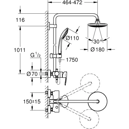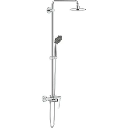 Das Grohe Duschsystem Vitalio Joy 180 mit Einhandmischer ist für die Wandmontage geeignet. Es besteht aus einem horizontal schwenkbaren 450 mm Duscharm. Das System verfügt über drei Strahlarten für besonderen Komfort: Rain, SmartRain und Massage. Der Grohe SprayDimmer garantiert eine stufenlose Reduktion der Durchflussmenge. Die Handbrause ist flexibel in der Höhe verstellbar mittels Gleitelement. Die Grohe EcoJoy Wasserspar-Technologie ist besonders gut für die Umwelt und reduziert den Wasserverbrauch. Dabei verteilt die Grohe DreamSpray® Technologie das Wasser gleichmäßig auf alle Düsen. Die glänzende Grohe StarLight® Chrombeschichtung macht die Armatur nicht nur besonders pflegeleicht, sondern auch zu einem echten Hingucker in Ihrem Bad. Mit dem SpeedClean Antikalk-System hat Kalk in Ihrer Dusche keine Chance mehr. Der Brausenschlauch verfügt über ein Twistfree und ist somit gegen ein Verdrehen geschützt. Das Grohe Duschsystem Vitalio Joy 180 ist für Durchlauferhitzer ab 18 kW/h geeignet.