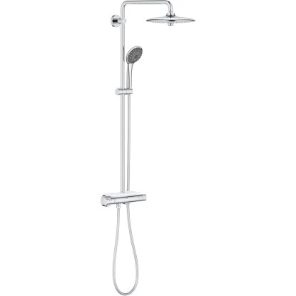 Das Grohe Duschsystem Vitalio Joy 260 bietet vereint Designerstil mit Duschgenuss. Die Brausegarnitur wird mit einer Aufputz-Thermostatbatterie geliefert. Das Duschsystem ist für die Wandmontage konzipiert und für Durchlauferhitzer ab 18 kWh geeignet.