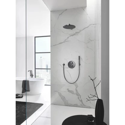 Die Grohe Rainshower Cosmopolitan 310 Kopfbrause-Set in der Farbvariante Hard Graphite verfügt über einen 380 mm großen Arm.