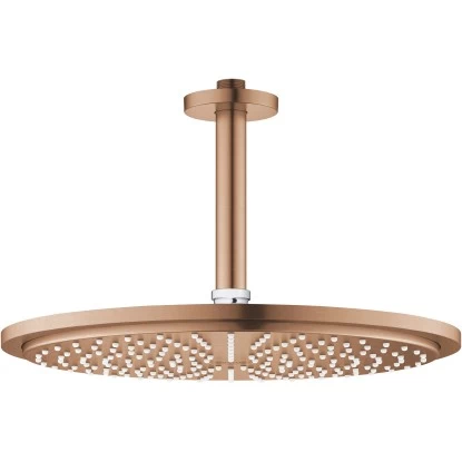 Das Grohe Rainshower 310 Kopfbrause-Set in der Farbvariante Warm Sunset gebürstet verfügt über einen 142 mm großen Duscharm und eignet sich für die Deckenmontage.