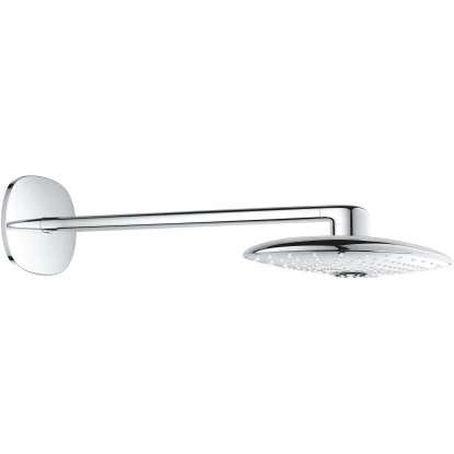 Die Kopfbrause verfügt über einen XXL Auslauf, der für einzigartige Duscherlebnisse sorgt. Dank des breiten Durchmessers von 360 mm wird Ihr ganzer Körper mit Wasser verwöhnt. Mit der Auswahl zwischen zwei verschiedenen Strahlarten können Sie Ihre Duschmomente individuell gestalten. Der Rain Strahl bietet einen angenehmen Wasserstrahl, der einem warmen Sommerregen gleicht. Der TrioMassage Strahl ist kraftvoll und wirkt belebend. Durch die Ausladung des Brausearms von 450 mm reicht die Brause weit in die Dusche, damit Sie mehr Platz für die Körperpflege haben. Dank Grohe DreamSpray wird das Wasser gleichmäßig verteilt, so wird für ein perfektes Strahlbild gesorgt. Dabei lässt sich die Brause besonders leicht von Kalk entfernen. Durch das Antikalk-System SpeedClean lassen sich Kalkablagerungen an den Düsen einfach mit dem Finger abwischen.