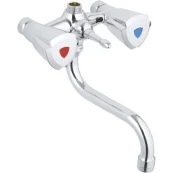 Die Grohe QuickFix Brausebatterie CostaTrend verfügt über einen S-Auslauf mit einer 150 mm Ausladung. Die zwei verschraubbaren Dreikantgriffe sind mit einer blauen und roten Markierung gekennzeichnet. Der Kunststoff ist verchromt und wärmeisoliert.