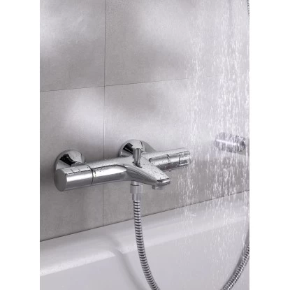 Gönnen Sie sich eine unkomplizierte, familienfreundliche Zeit im Bad. Die Grohe QuickFix Thermostat-Wannenarmatur Precision Start ist mit erstklassigen Sicherheitsfunktionen und intuitiven Bedienelementen ausgestattet. Mit ihrem schlanken, zylindrischen Design verleiht diese wandmontierte Armatur jedem Badezimmer einen modernen, minimalistischen Look. Mit ihrem attraktiven Preis ist sie die ideale Option, um Ihr Badezimmer um eine komfortable Dusche mit Thermostat zu ergänzen. Im Inneren des Thermostatgehäuses aus Massivmetall hält die Grohe TurboStat Technologie das Wasser auch bei schwankendem Wasserfluss durchgängig auf einer konstanten Temperatur. Mit der familienfreundlichen Grohe SafeStop Taste kann für die Dusche eine maximale Temperatur von 38 °C eingestellt werden. Das verhindert, dass insbesondere Kinder aus Versehen die Wassertemperatur zu hoch einstellen. Für noch mehr Schutz lässt sich mit dem Grohe SafeStop Plus Temperaturbegrenzer ein absoluter Grenzwert von 43 °C einstellen.