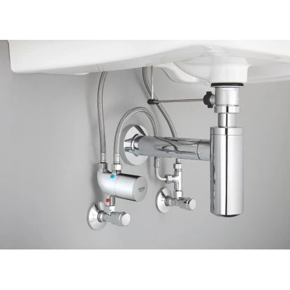 Der Grohe Thermischer Verbrühschutz Grohtherm Micro verfügt über Temperatureinstellungen zwischen 15°C – 43°C (± 2°C). Die thermische Desinfektion erfolgt ohne erneute Temperatureinstellungen. Der untere Anschluss verfügt über eine 10 mm (3/8″) Überwurfmutter. Der obere Anschluss verfügt ebenfalls über ein 10 mm (3/8″) Außengewinde.