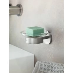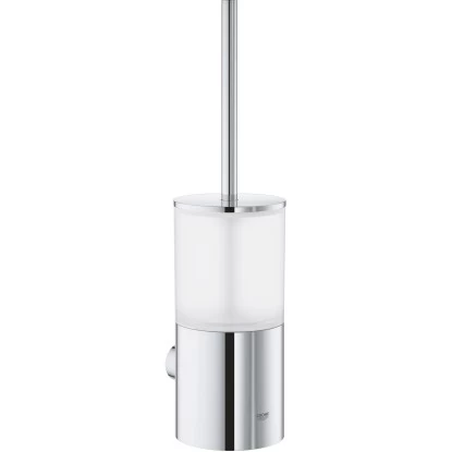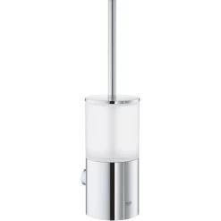 Die Grohe Toilettenbürstengarnitur Atrio verfügt über ein modernes und zeitloses Design. Der Behälter für die Toilettenbürste besteht aus Glas und das äußere Metallkonstrukt eignet sich für die Wandmontage.